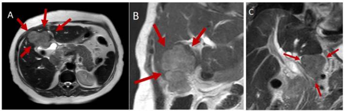 | Imagen 5.- Resonancia magnética que muestra gran masa en la vesícula biliar con infiltración al hígado (A y B) y conglomerado ganglionar celíaco (C). |